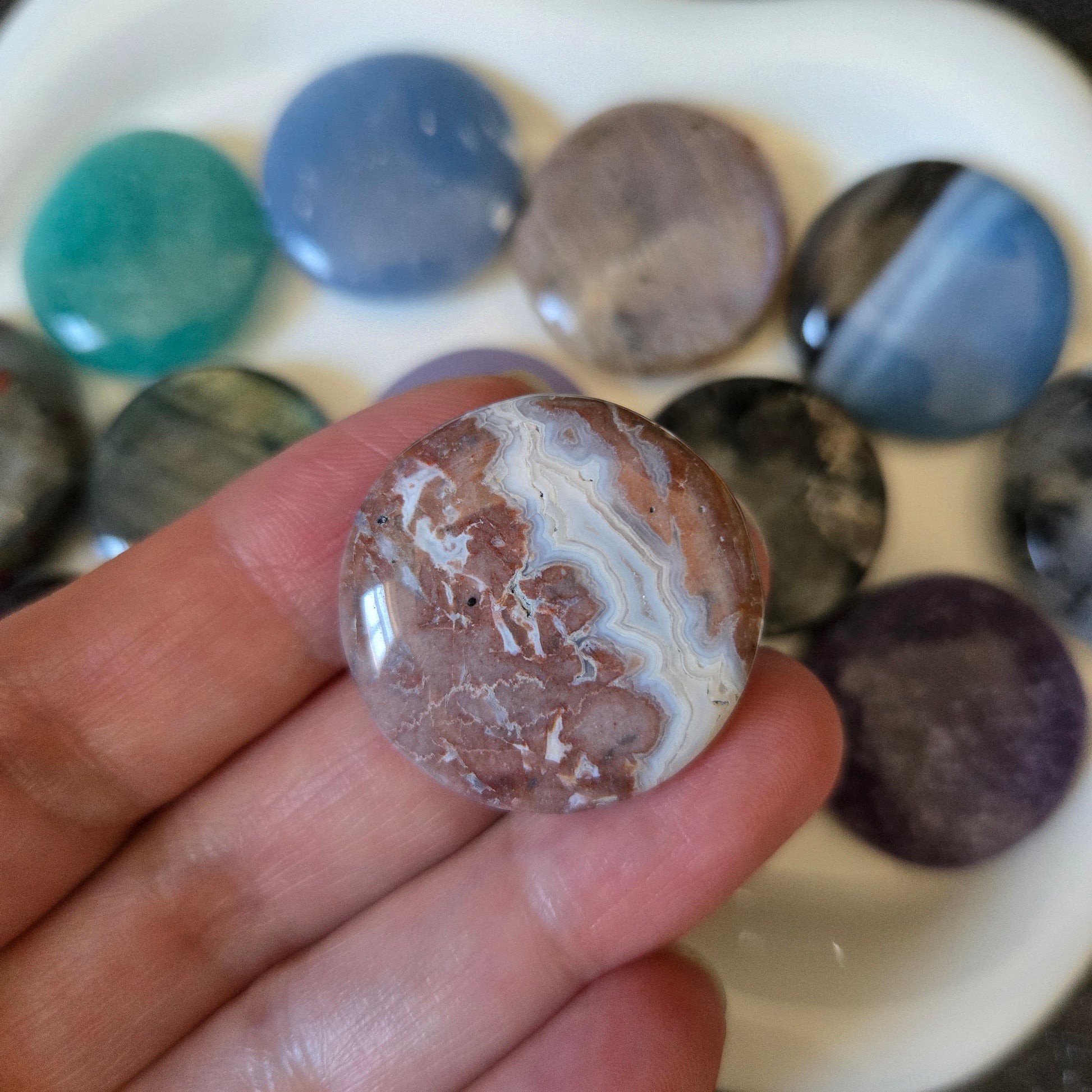 Sangria Lace is a richly patterned stone, usually showcasing layers of deep wine, plum and berry tones flowing through softer creams, greys or taupes. Its natural banding often appears in ripples, waves or lace-like swirls, giving each piece a beautifully intricate, almost hand-painted look. Some stones are bold and high-contrast, while others feel more muted and dreamy, like dusk skies over rolling hills.